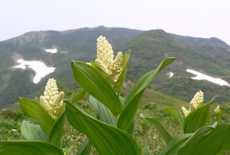 朝日岳をバックに、コバイケイソウ