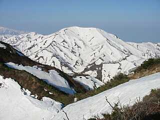 犬ヶ岳から眺める朝日岳方面 遠く剱岳も望める 03.4.28